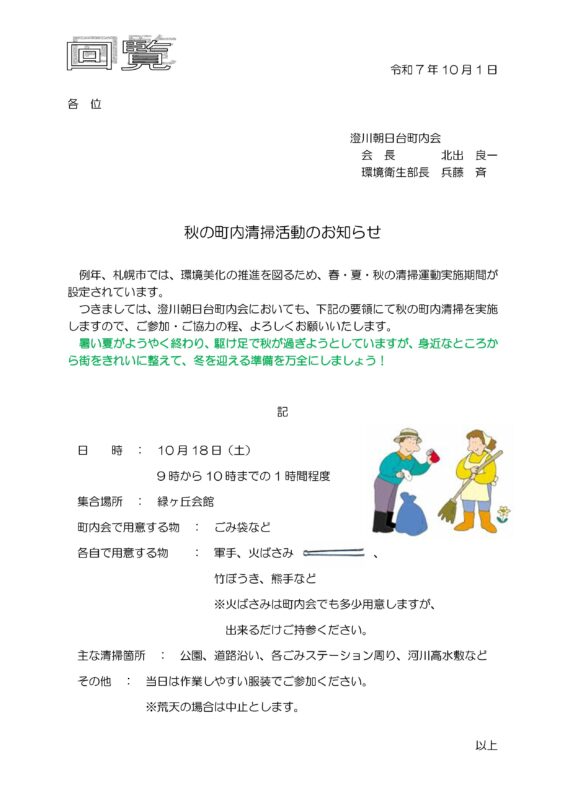 2.秋の町内清掃活動 10月18日(土)9時 緑ヶ丘会館集合
