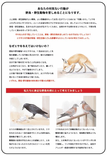 管内で、野生鳥獣(キツネ、カラス、鳩等)に対しての餌やりをするひとがいるとの申し出が時々あります。野生鳥獣にエサを与えることによる弊害は、市の広報紙等で知らされていることです。