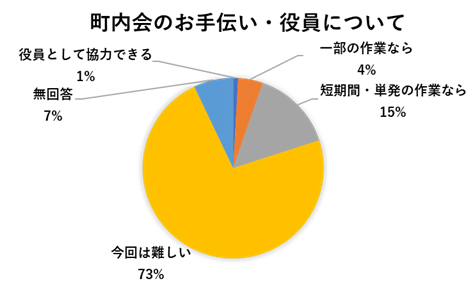 - 役員会からのコメント: そうですね。切り出しやすい仕事としては、町内会のイベントの準備・後片付けや、毎月の回覧物の仕分け作業などがあります。「手伝い可能」と回答を下さった方に、まずは、そういった具体的な作業をお手伝いしていただけないか相談してみる予定です。