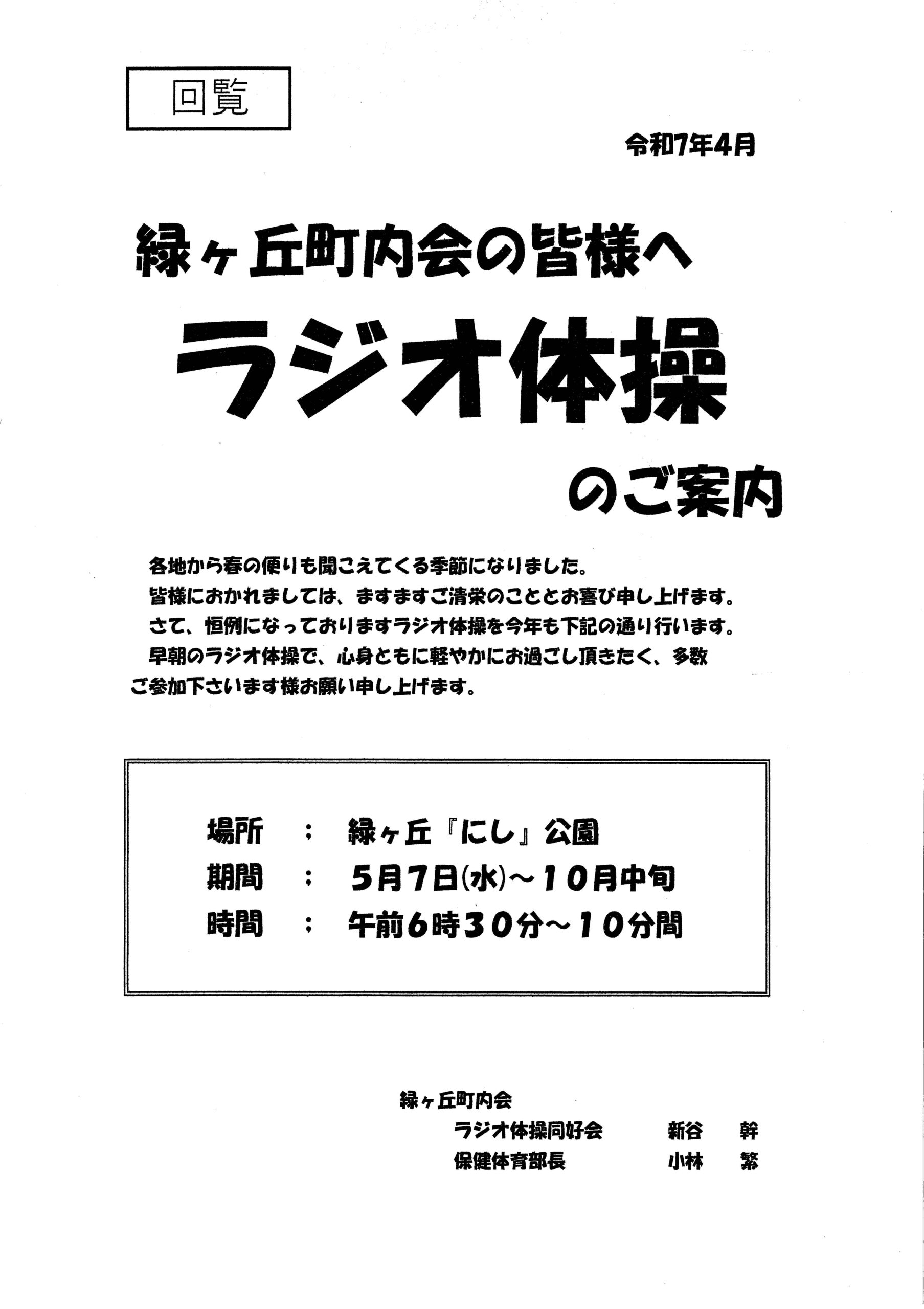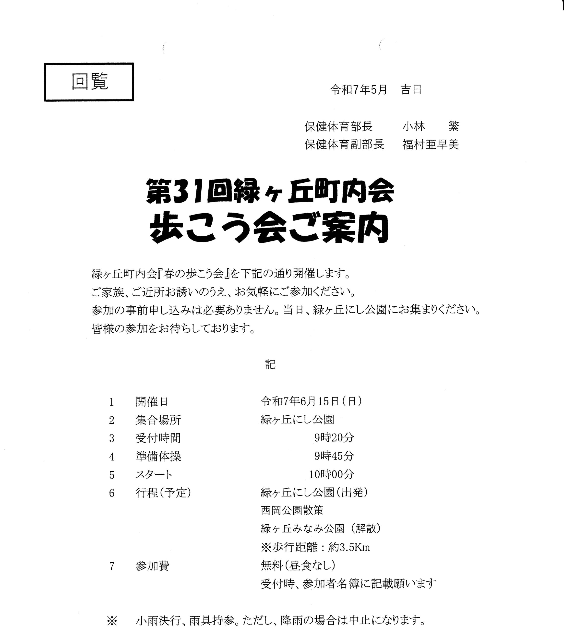 今年度の活動が始まりました。5月~6月にかけての行事のお知らせをいたします。 環境衛生部より 春の清掃運動(5月10日) 春の清掃運動の実施について.pdf 花いっぱい運動(5月18日土おこし 5月25日花苗植え) 「花いっぱい運動」へのご協力について(回覧).pdf 防災部より 防災出前講座(5月17日) 防災出前講座.pdf 保健体育部より ラジオ体操(~10月まで) 歩こう会_春(6月15日) 前へ 記事一覧 次へ